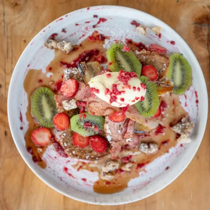 Golden brioche stacked with bacon, caramelised banana, candied walnuts, seasonal fruit, berry compote, and maple syrup. A perfectly sweet and savoury combination that brings indulgence to your brunch table.