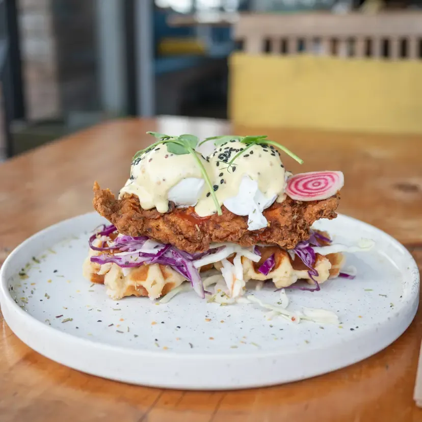 Crispy southern fried chicken over golden waffles, layered with slaw, poached egg, buffalo glaze, hollandaise, and sesame. A bold, comforting dish that hits sweet, savoury, and spicy notes at once.